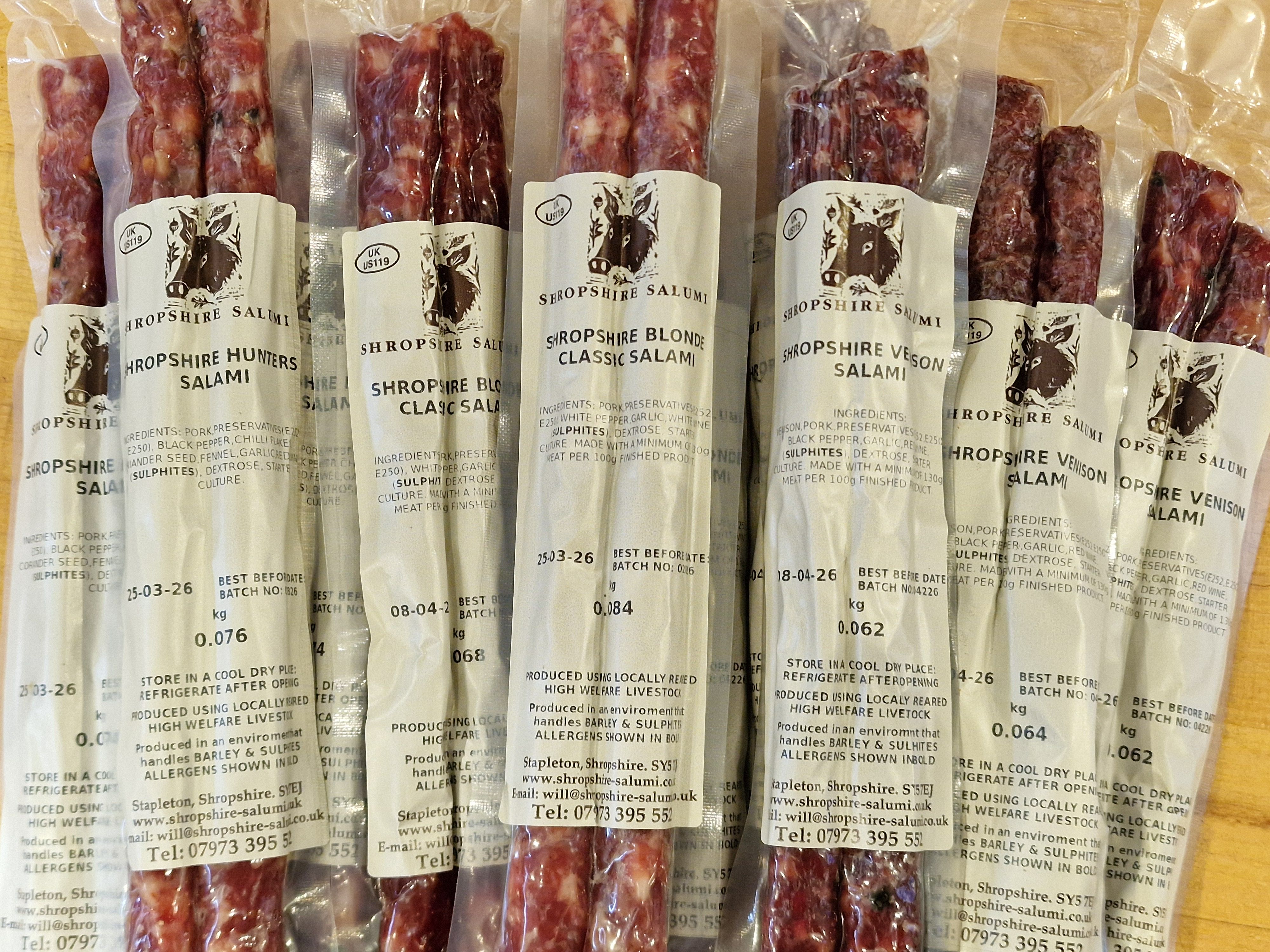 "Shropshire Salumi is a small company based to the north of Shrewsbury producing handmade Salumi the traditional way, priding ourselves on the quality of ingredients, artisan methods and our nose to tail ethos. All the pork we use is outdoor reared Gloucester Old Spot sourced within 2 miles of the premises, all spices are sourced from ethical suppliers and are of the finest quality and we use traditional casings for our products. "